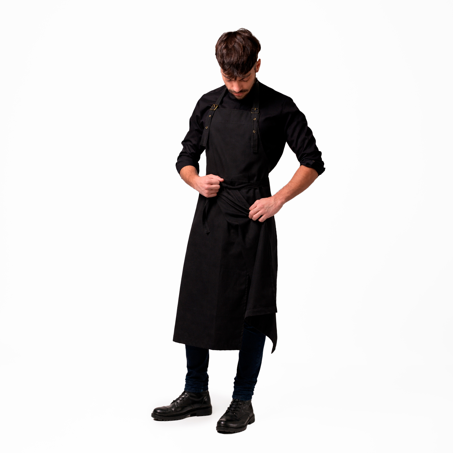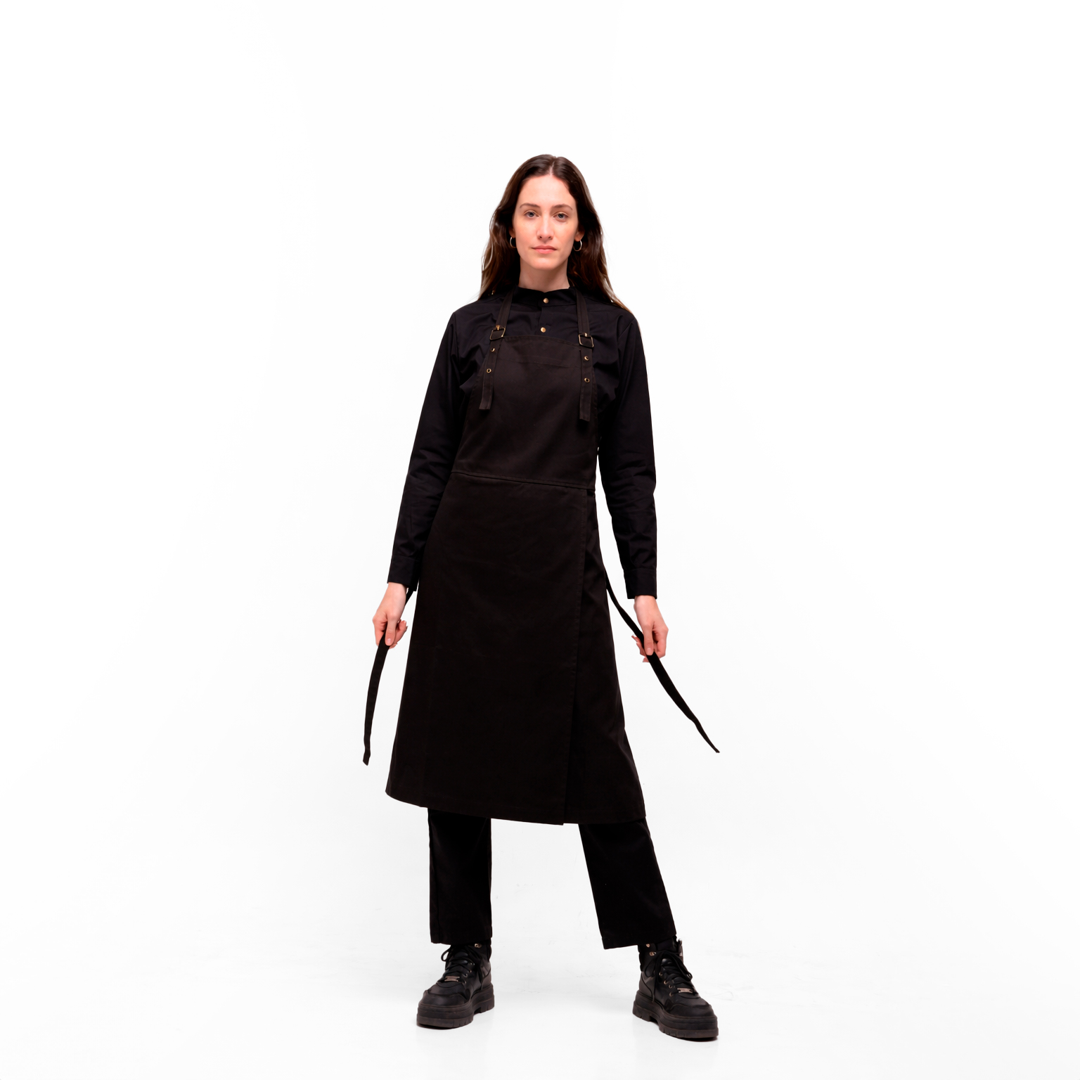 Un delantal creado para acompañar tus movimientos. Su característica principal es la apertura en la cintura, que facilita agacharse, caminar y moverse sin limitaciones. Con correa regulable y hebillas de bronce.
