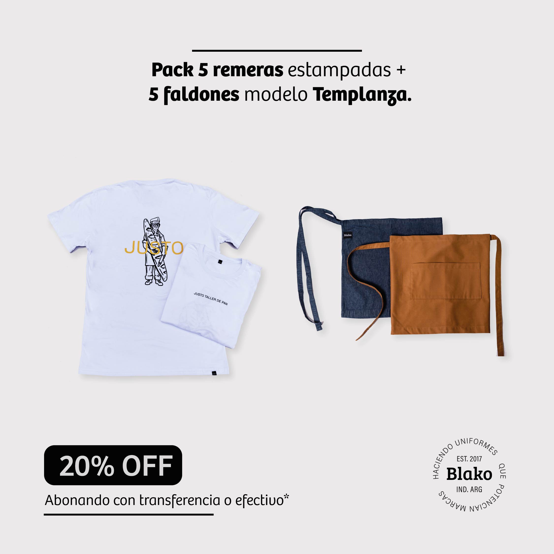El pack incluye 5 remeras personalizadas con tu logo y 5 faldones Templanza en color hueso o jean.